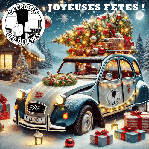 A festive Citroën 2CV from La Croisée Des Deuches, decorated for Christmas with a tree on top, wishing 'Happy Holidays!'.