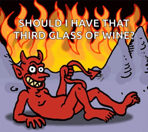 A cartoon devil from Lcne Hell ponders having a third glass of wine, set against a backdrop of flames.