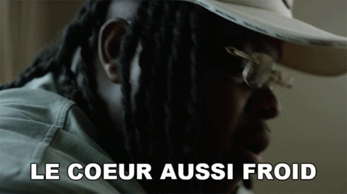 Izzy S with dreadlocks, hat, and glasses, expressing 'The heart as cold as my metal' on screen.