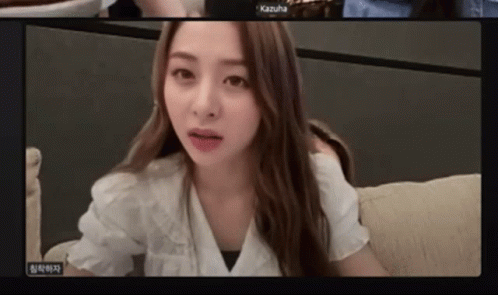 Le Sserafim's Yunjin makes a displeased face during a video call, with 'Kazuha' visible on screen.