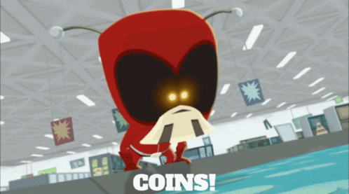 Voltar from League Of Super Evil excitedly shouts "COINS!" with glowing eyes.
