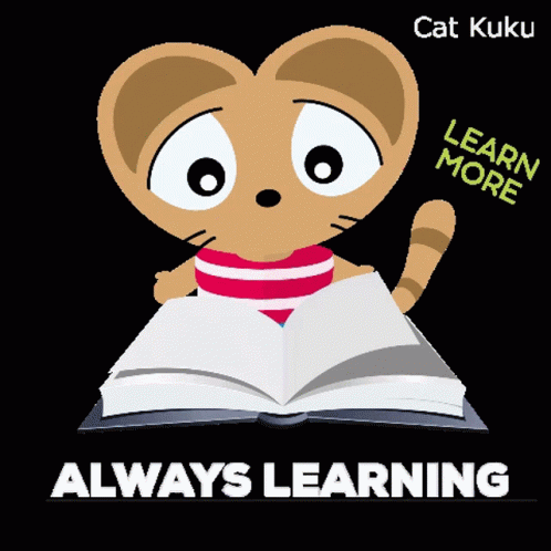 Cat Kuku, a cartoon cat, is engrossed in reading an open book, emphasizing the theme of continuous learning.