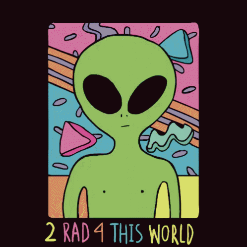 Green alien with black eyes making a hang loose sign, with text '2 RAD 4 THIS WORLD' on a colorful background.