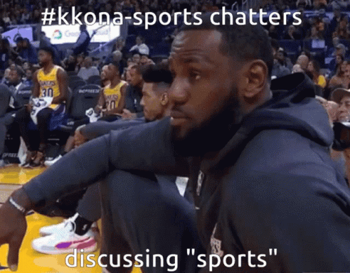 Lebron James sits courtside, seemingly reacting to #kkona-sports chatters discussing "sports" with a subtle expression.