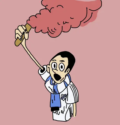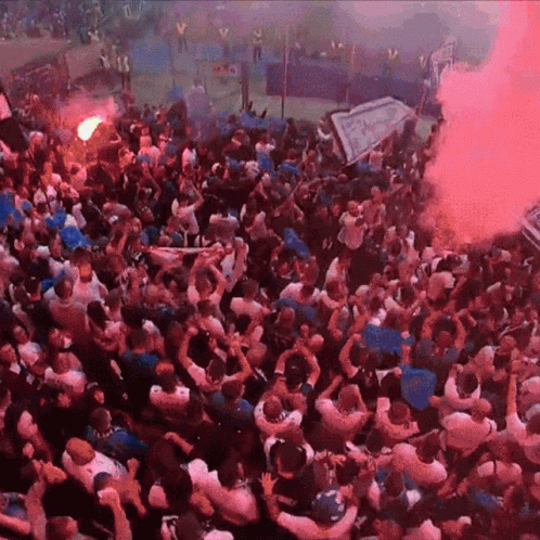Lech Poznan fans celebrate their championship victory in a stadium, with flares and a large banner.