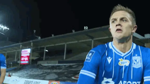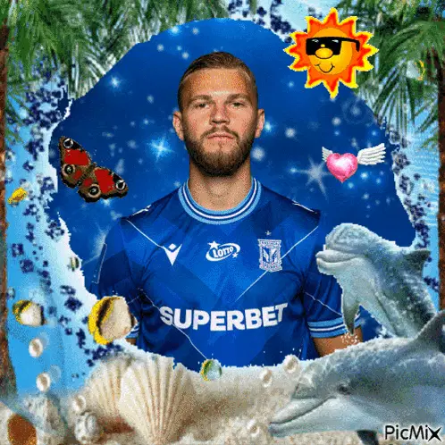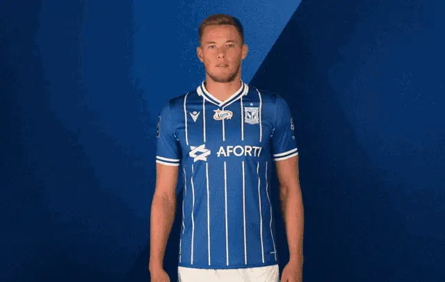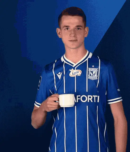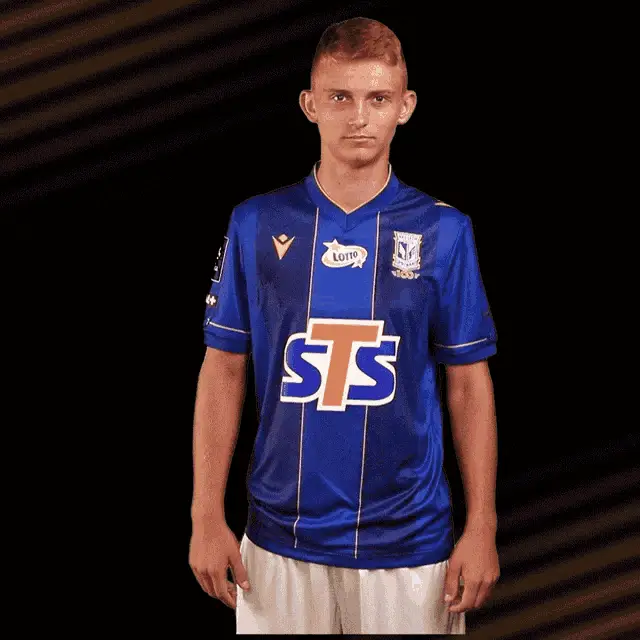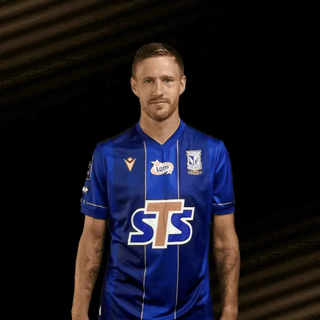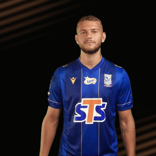 Lech Poznań footballer in blue jersey smiles and crosses arms, representing Kolejorz.