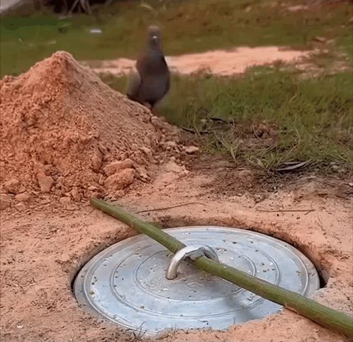 A pigeon walks towards a hidden trap in the ground, steps on it, and falls into the hole.