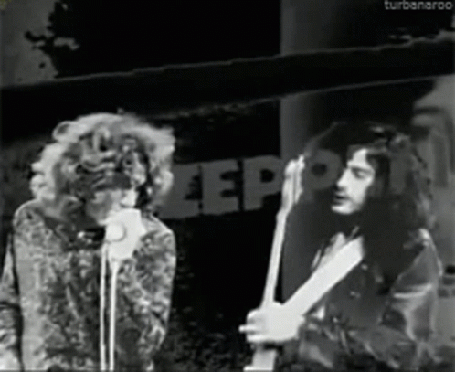 Robert Plant sings while Jimmy Page plays guitar during a live performance by Led Zeppelin.