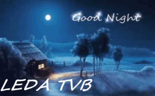 A serene night scene with a cozy house under a full moon, wishing 'Good Night LEDA TVB'.