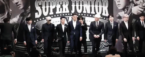 Lee Donghae and Super Junior members bow in unison at a press conference, dressed in sharp suits.