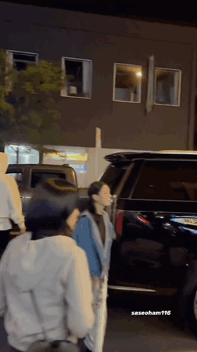 Lee Dongwook walking down a city street at night, wearing a white hoodie and black pants, passing by parked cars.