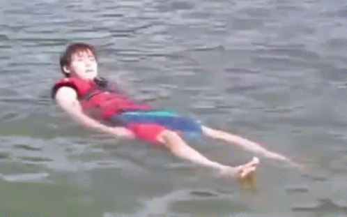Lee Jangjun of Golden Child floats on his back in water, wearing a life vest and swim shorts.