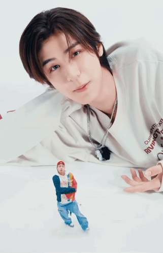Leehan from Boynextdoor performs in the 'ABCDLOVE' music video, with a giant figure of Jaehyun.