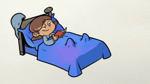 A charming cartoon shows a person reading a book in bed, then peacefully falling asleep.