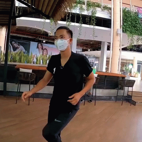 A man in a mask performs dynamic leg stretches and exercises in an indoor public space.