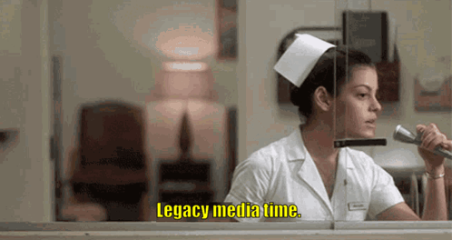 A woman in a nurse's uniform speaks into a microphone, saying "Legacy media time."