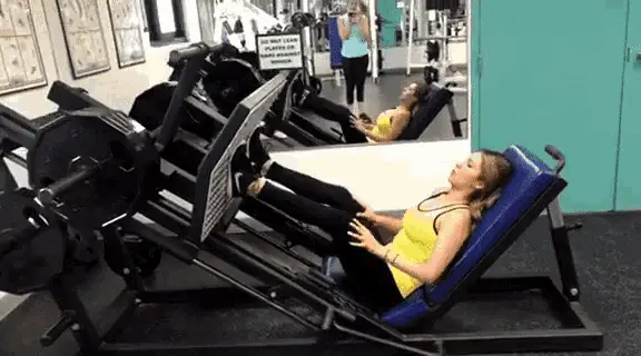 Woman performing 45-degree leg press exercise in a gym, demonstrating proper form for leg training.