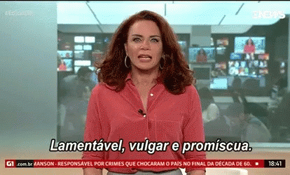 Leilane Neubarth delivers a news segment, speaking the words 'Lamentável, vulgar e promíscua'.