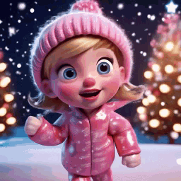 Lekany, a cute animated girl, celebrates New Year in a snowy wonderland with festive Christmas trees.