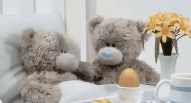 Two teddy bears on a bed, one comforting the other, with breakfast and flowers, wishing a speedy recovery.