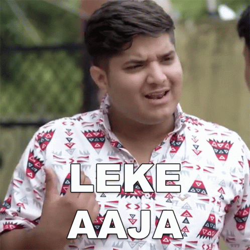 Mridul makes a funny face while wearing a shirt with 'Leke Aaja' (Bring it) written on it.