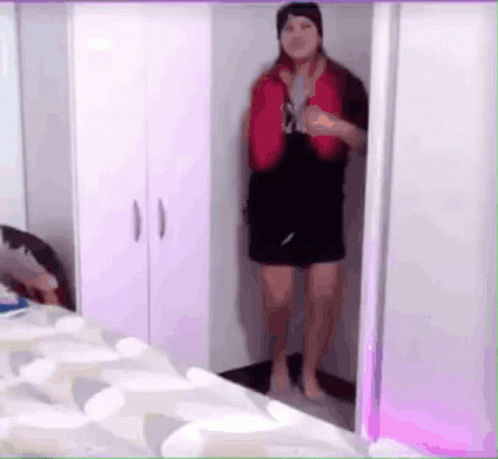 Lelabuffo performs a lively samba dance in a room, wearing a red vest and black shorts.