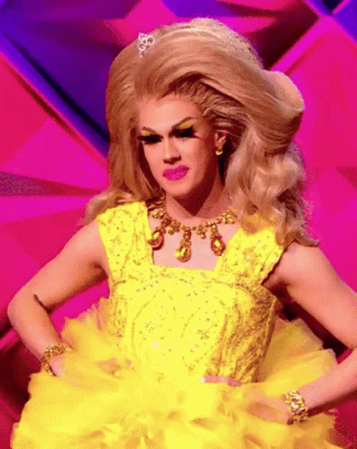 Lemon, a drag queen from RuPaul's Drag Race, wearing a vibrant yellow dress, looks up and gives a confident nod.