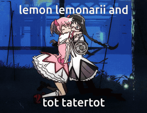 two anime girls hugging with the words lemon lemonarii and tot tatertot