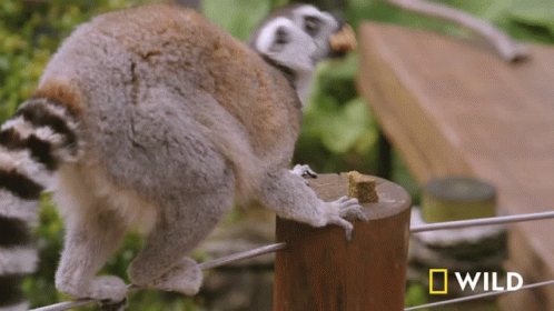 A ring-tailed lemur enjoys a snack while perched on a wooden post, featured on National Geographic Wild.