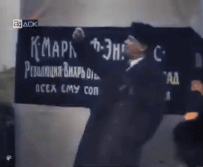 Vladimir Lenin delivers a passionate speech in front of a banner referencing Karl Marx and Friedrich Engels.