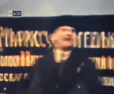 Vladimir Lenin, the revolutionary orator, delivers a powerful speech, clenching his fist in a historic moment.
