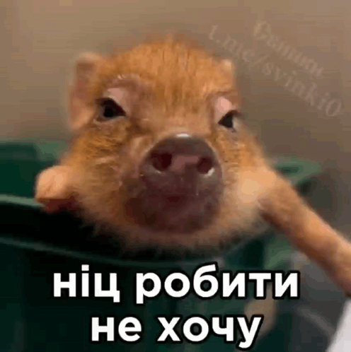 A cute mini pig looking sleepy and lazy, with the Ukrainian caption 'I don't want to do anything'.