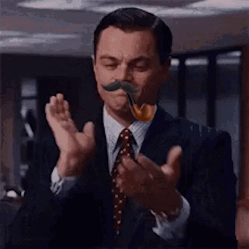 Leonardo DiCaprio claps enthusiastically, sporting a fake mustache and smoking a pipe.