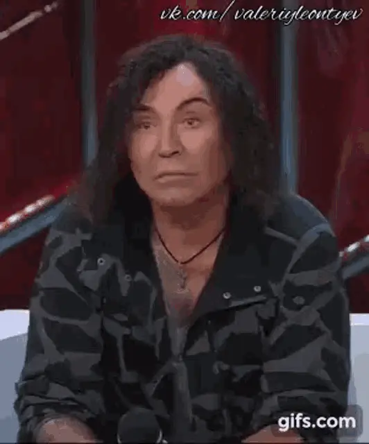 Valeriy Leontyev, a man with long hair, emphatically says 'No!' while holding a microphone.