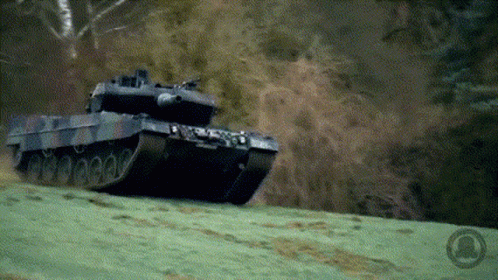 A Leopard tank demonstrates its stabilization system while driving down a grassy hill.