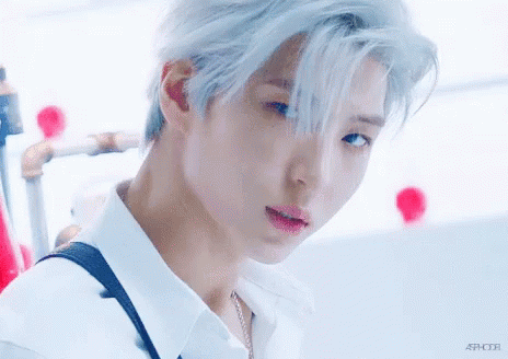 VIXX's Leo with striking white hair and blue eyes, wearing a white shirt and suspenders, looking intensely at the camera.
