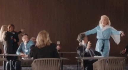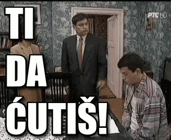 Lepa Brena energetically dancing in a light blue outfit, with the caption 'Ej Žali Žali Bože'.