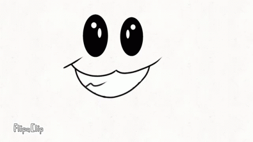 Animated cartoon face with black eyes blinking and a pink mouth moving.