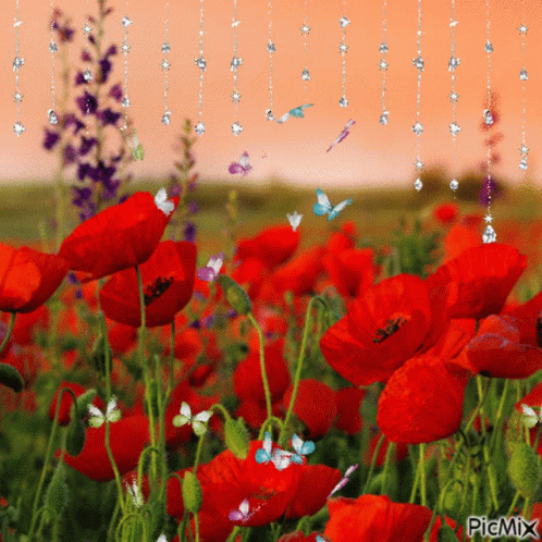 A vibrant field of red poppies and purple flowers with butterflies fluttering, sparkling effects, commemorating Remembrance Day.