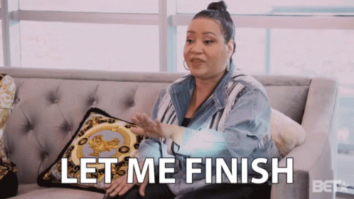 Cheryl James (Salt from Salt-N-Pepa) emphatically states 'Let Me Finish' while sitting on a couch.