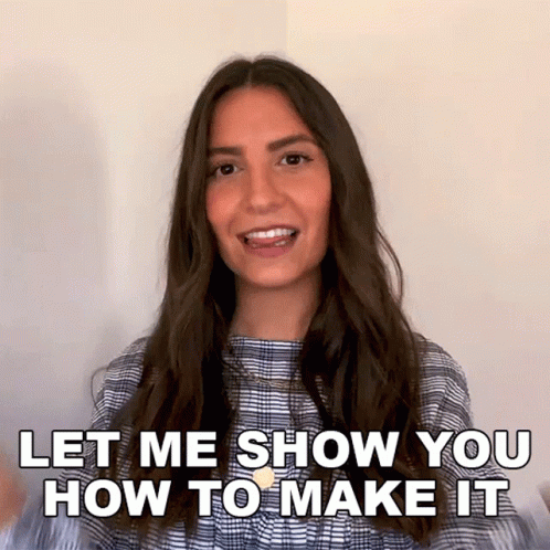 Alexandra Machover enthusiastically invites viewers to learn how to make something, pointing with both hands.