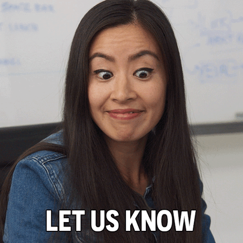 Melody Peng makes a funny face with the text 'LET US KNOW' from 'I Think You Should Leave with Tim Robinson'.