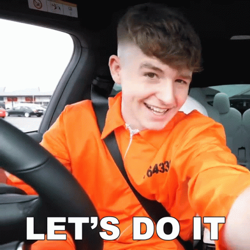 Adam Beales, dressed in an orange jumpsuit, enthusiastically says 'Let's Do It' from a car.