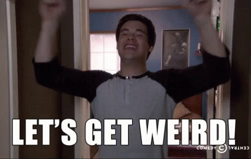 Adam Devine enthusiastically exclaims 'LET'S GET WEIRD!' with his arms raised in excitement.