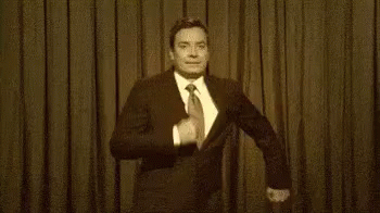 Jimmy Fallon dances and exits a stage in front of a curtain with the words 'Let's Go' displayed.