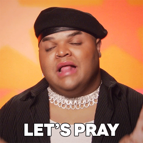 Kandy Muse, wearing a black beret and a sparkling choker, says 'Let's Pray' with a dramatic expression.