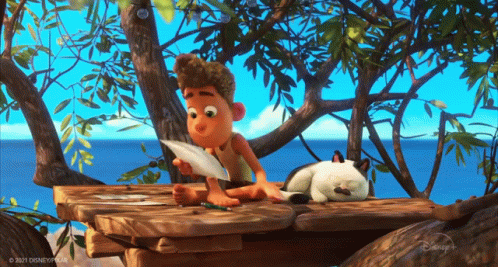 Luca, from Disney/Pixar's 'Luca,' sits in a treehouse by the sea, writing on papers with a sleeping cat nearby.