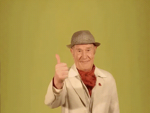 Gogo Andreu, wearing a hat and coat, smiles and gives a thumbs up gesture.