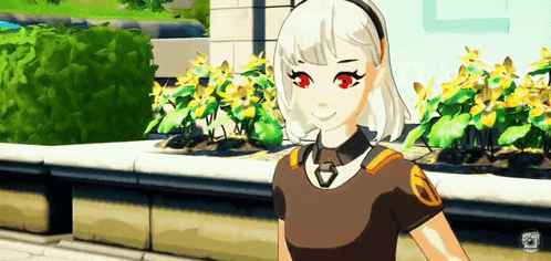 Lexa, the Fortnite character, smiles in an anime-style scene with white hair and red eyes.