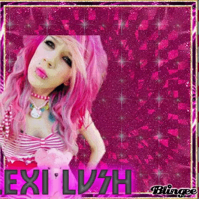 Lexi Lush, the pink-haired emo scene queen, poses with a teddy bear in a glittery aesthetic.